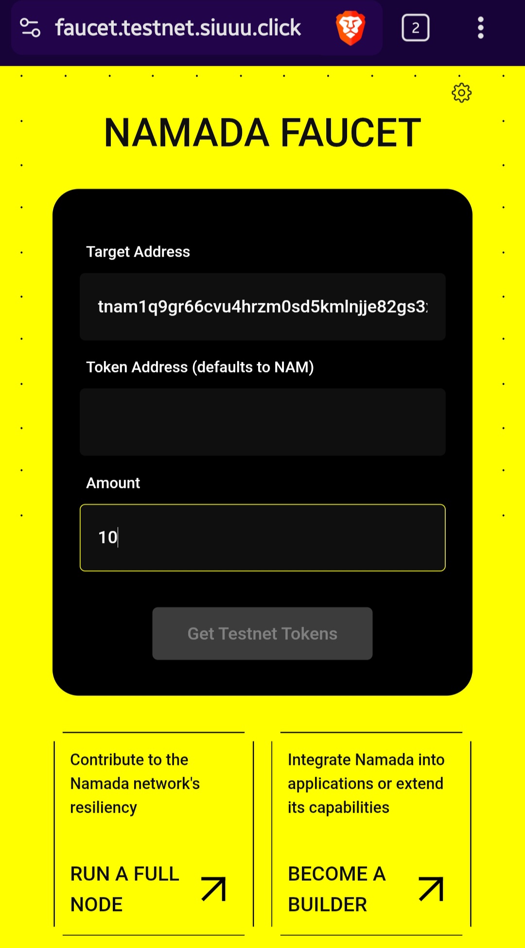The faucet UI behaves incorrectly and prevents sending any test NAM to my wallet.
